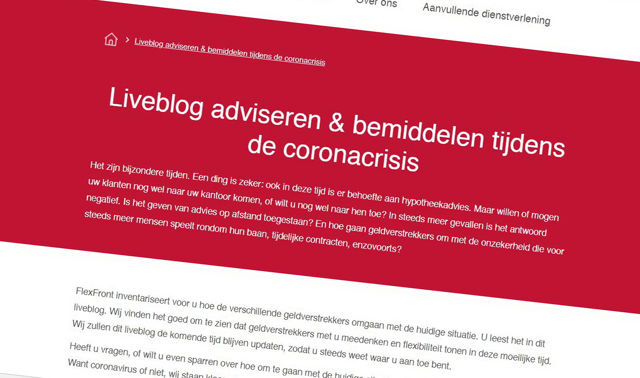 Crisis of niet, er blijft behoefte aan hypotheekadvies. Dat weet FlexFront maar al te goed. Om tussenpersonen goed te informeren is de serviceprovider begonnen met een liveblog waarin per geldverstrekker zichtbaar is welke tijdelijke beleidsaanpassingen van toepassing zijn.